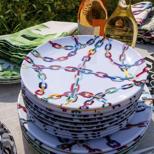 Tough and chip-resistant, melamine endures everyday use and outdoor dining.