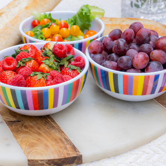 Melamine cleans easily in the dishwasher and stays vibrant, meal after meal.