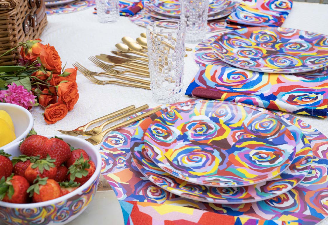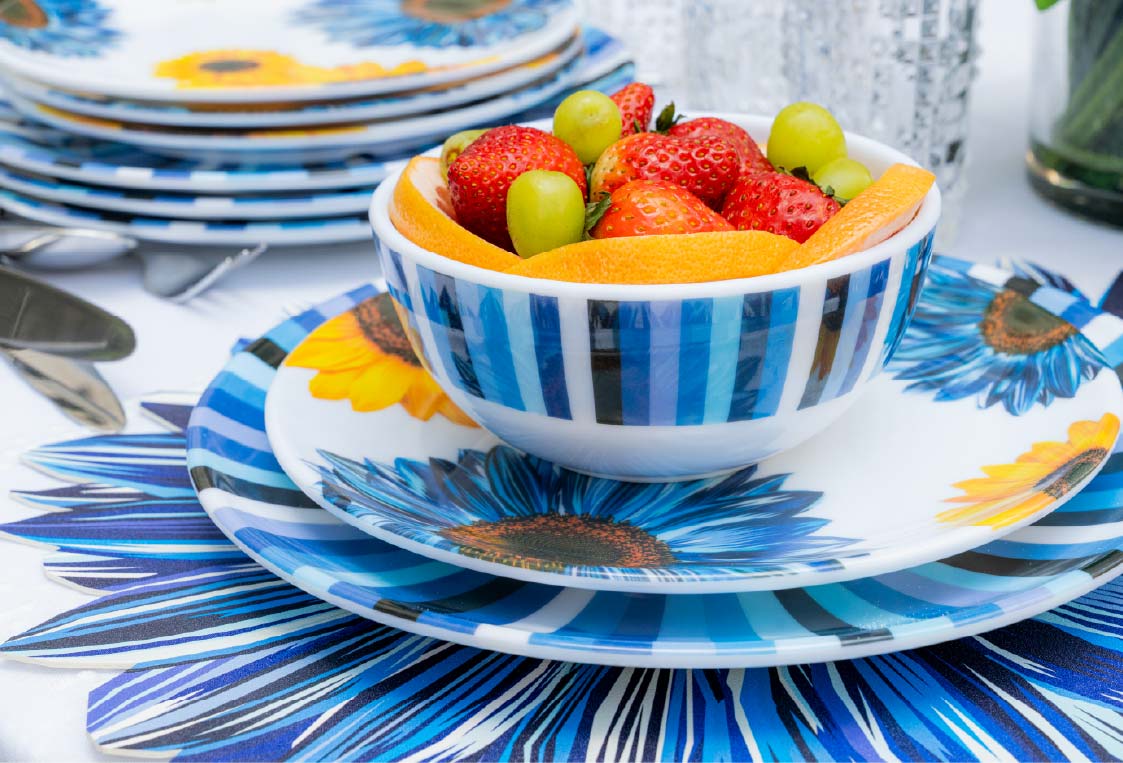 Melamine cleans easily in the dishwasher and stays vibrant, meal after meal.