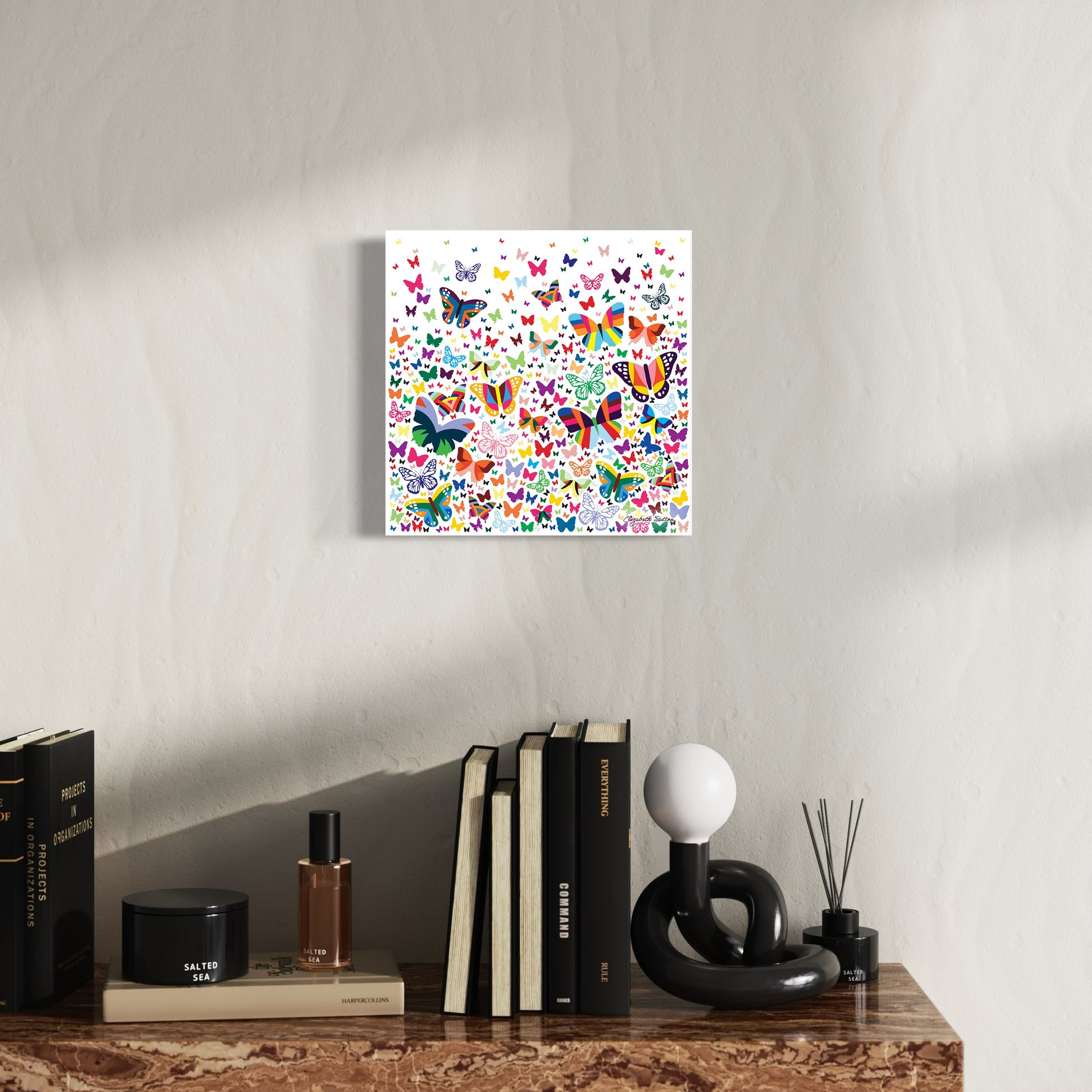 Inspired by nature and drawn from Sutton’s iconic design collections, this series features a striking blend of multicolor geometrics, elegant florals, rich blue palettes, and classic black & white motifs. Each digitally illustrated composition is a celebration of form, color, and organic beauty—featuring abstract butterflies in flight, rhythmic floral arrangements, and bold symmetrical designs that add depth and dimension to any wall. The patterns showcased in these prints mirror the exact designs featured on our best-selling dinnerware, allowing you to create a cohesive and elevated design statement throughout your home. Printed on high-quality canvas and gallery-wrapped for a seamless, frameless finish, these vibrant pieces are ready to hang and instantly elevate your space. Whether you’re styling a home, office, or creative studio, there’s a piece in this collection to match every mood and aesthetic.